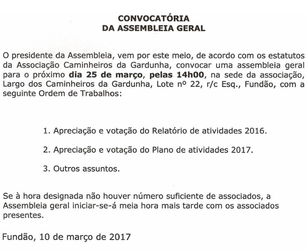 Decorreu no último Sábado dia 8 de Outubro a Assembleia Geral de eleição dos corpos sociais dos Caminheiros da Gardunha para o biénio 2017/2018. Ao sufrágio apresentou-se uma lista única que foi eleita com 90% de votos a favor.